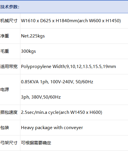 本自动侧打打包机 专门为大型之物品(如空调、冰箱、摩托车)捆包而设计;机器前后接驳输送线及电眼设备,使捆包实现自动化或完全无人化全自动作业